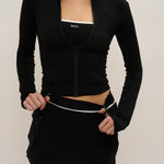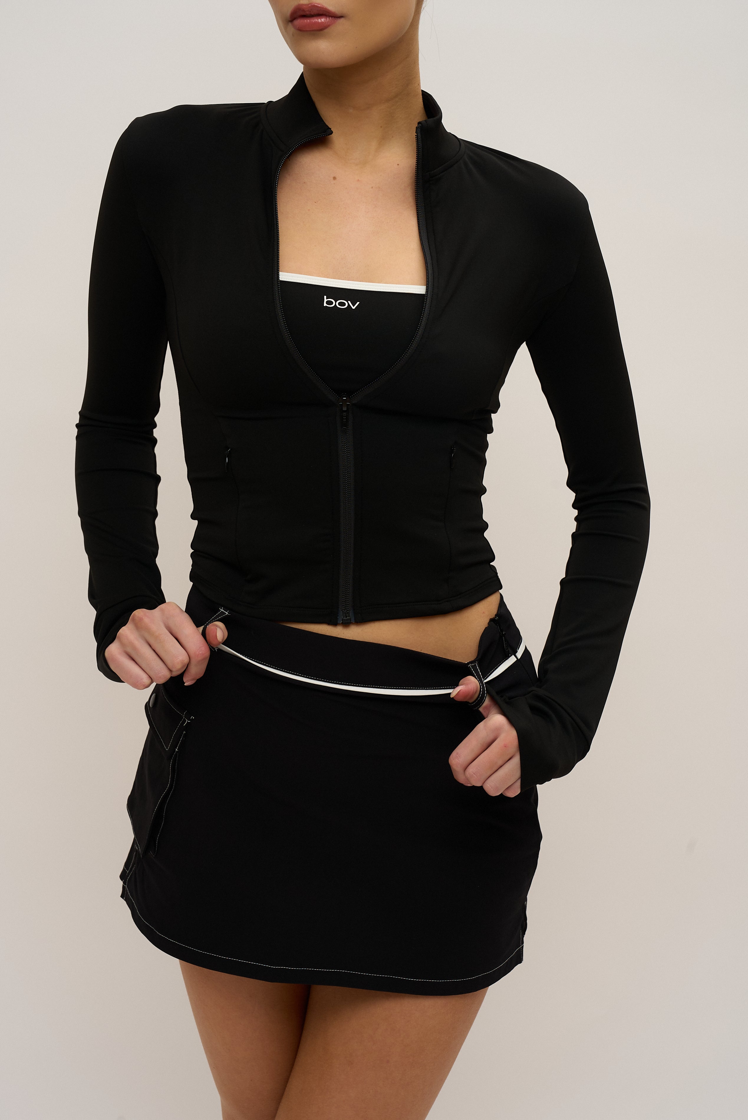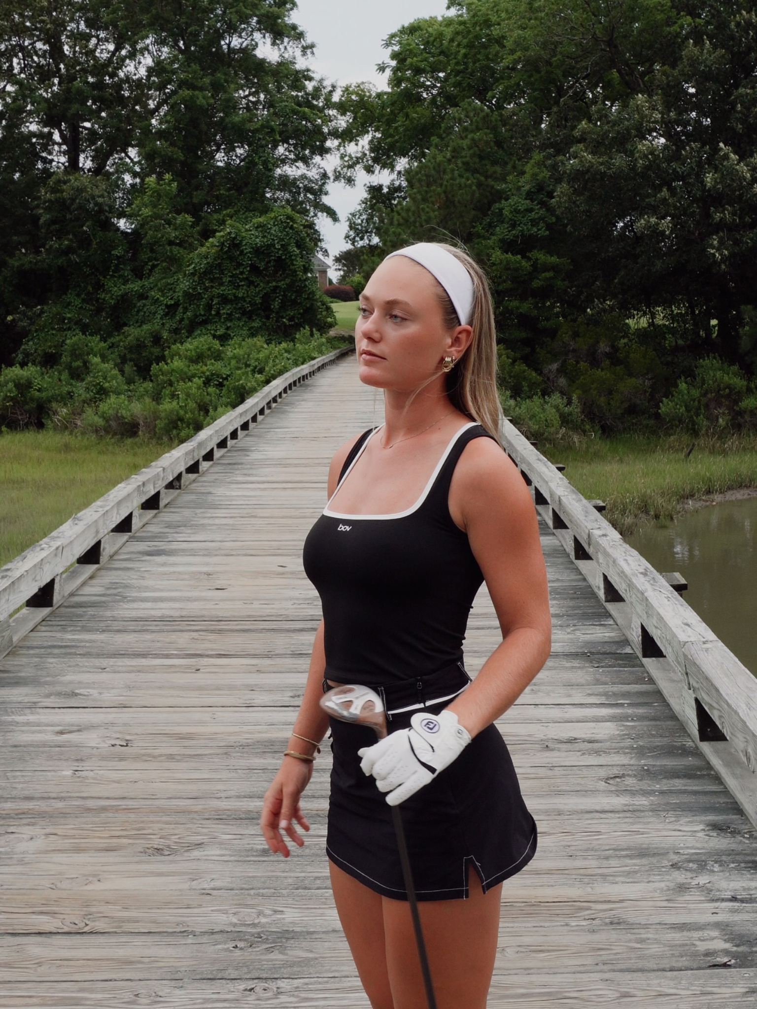 The Maeve Skort Set in sleek black is the ultimate IT girl sports outfit for golf and any racquet sport. The skort features a pocket for holding up to 2 tennis balls, golf tees, and other necessities. Made with quick-dry, water-wicking, and UV-protective fabric, it keeps you sweat-proof and protected.