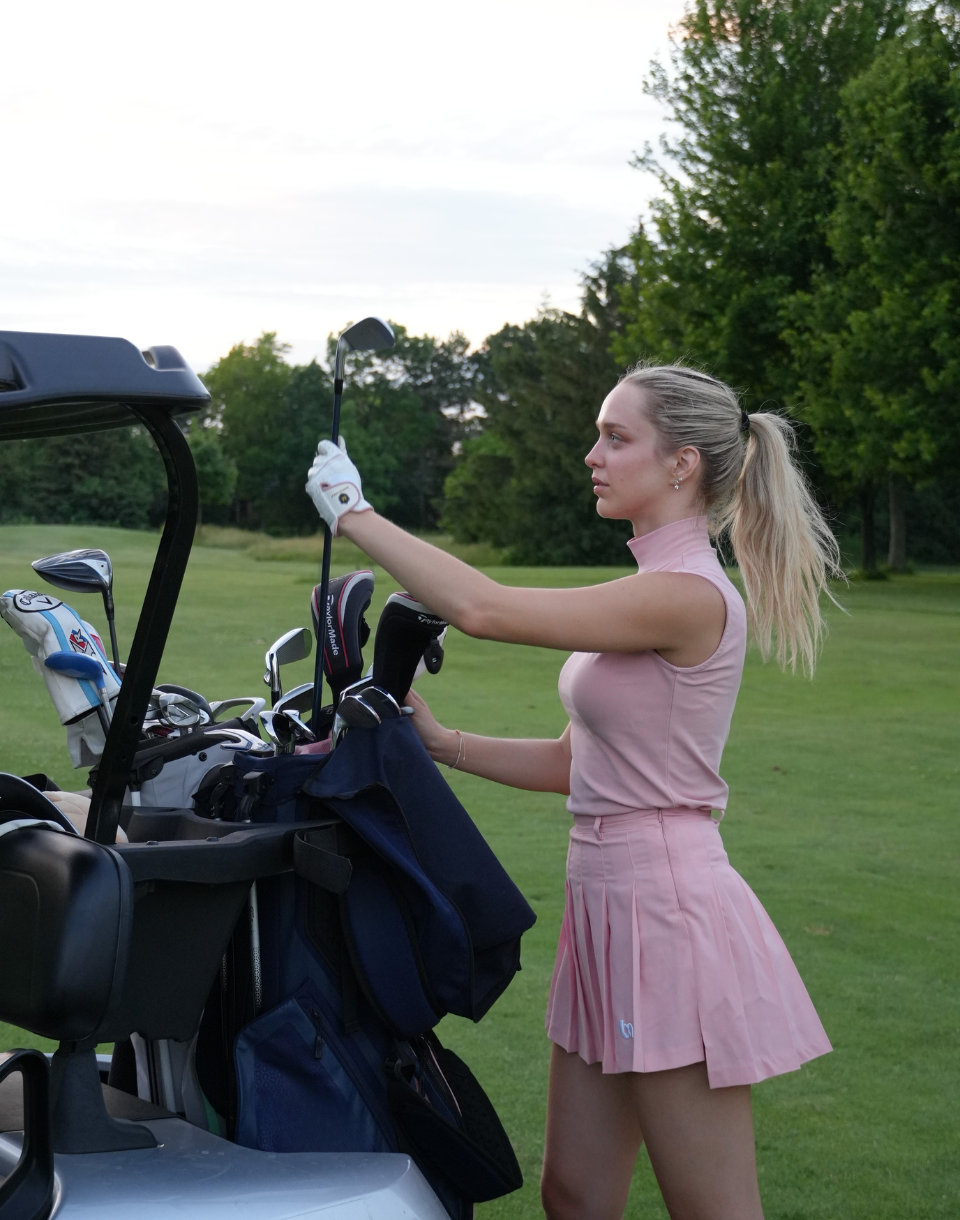 Elevate your style and functionality with the Pink Set - a must-have for any active woman. The pleated skirt offers more coverage, with a D ring for your ball pouch and sweat-wicking shorts attached. The mock up top provides UV protection and pairs perfectly with various bottoms.