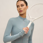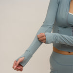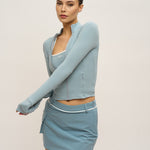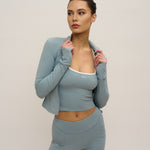 Enhance your wardrobe with our Maeve Sculpting Jacket in Aqua, crafted to perfection for the ultimate fit and style. Designed to enhance your figure, this jacket boasts thumbholes, discreet zippered pockets, and versatile styling options. It effortlessly pairs with other pieces in your wardrobe for any occasion. Expertly tailored with a mid-waist bottom and top for comfortable coverage at the belly button.