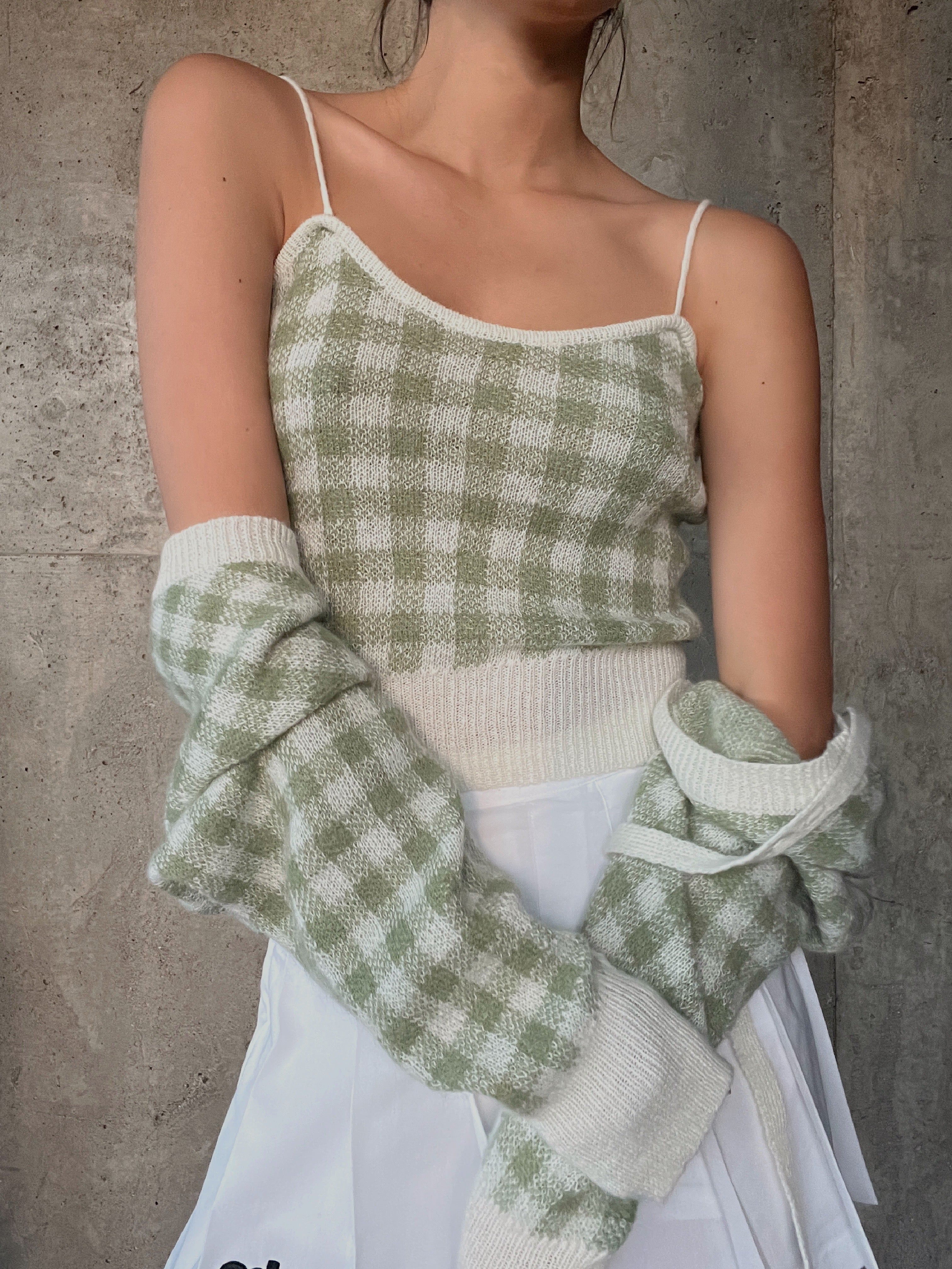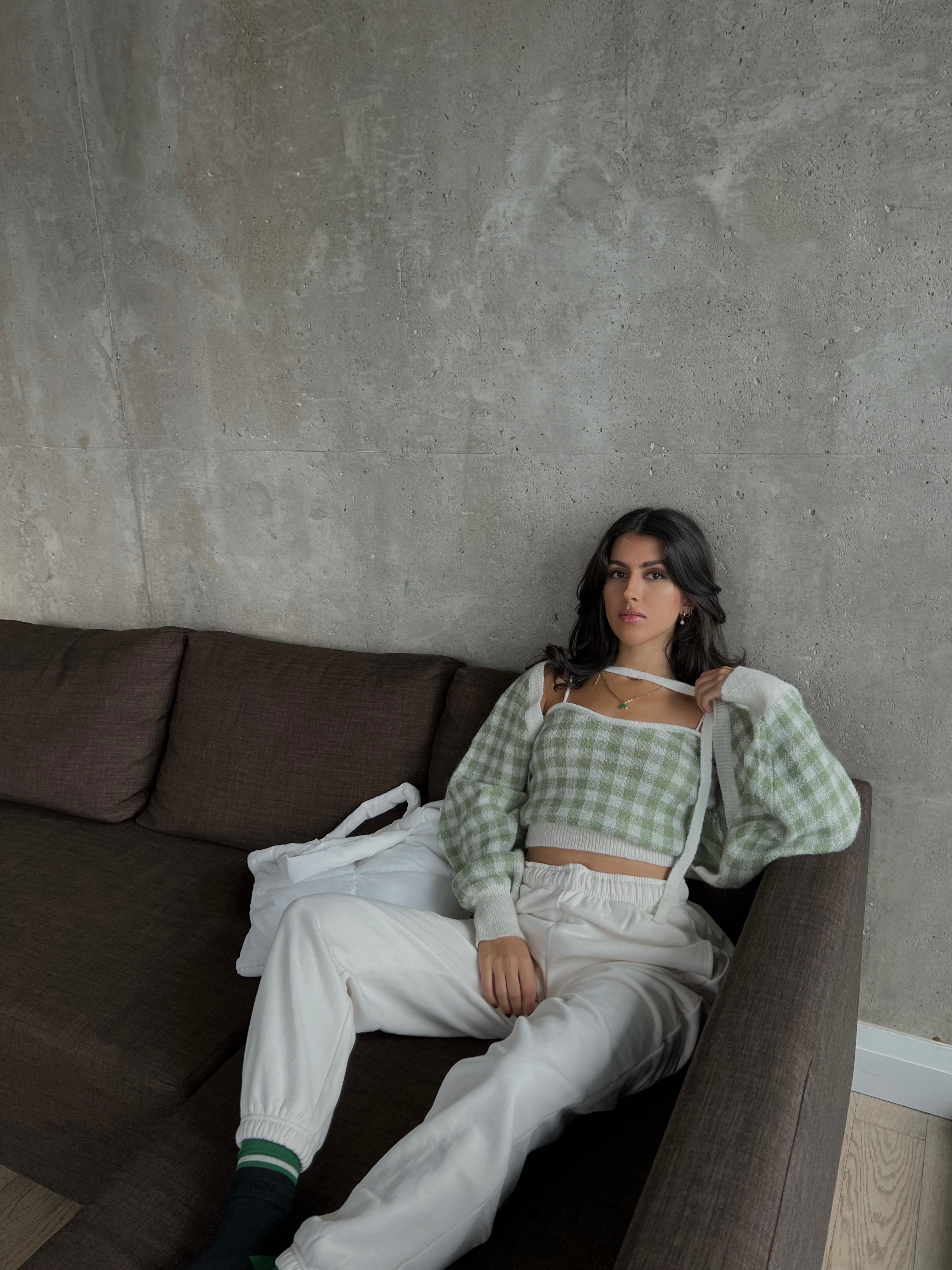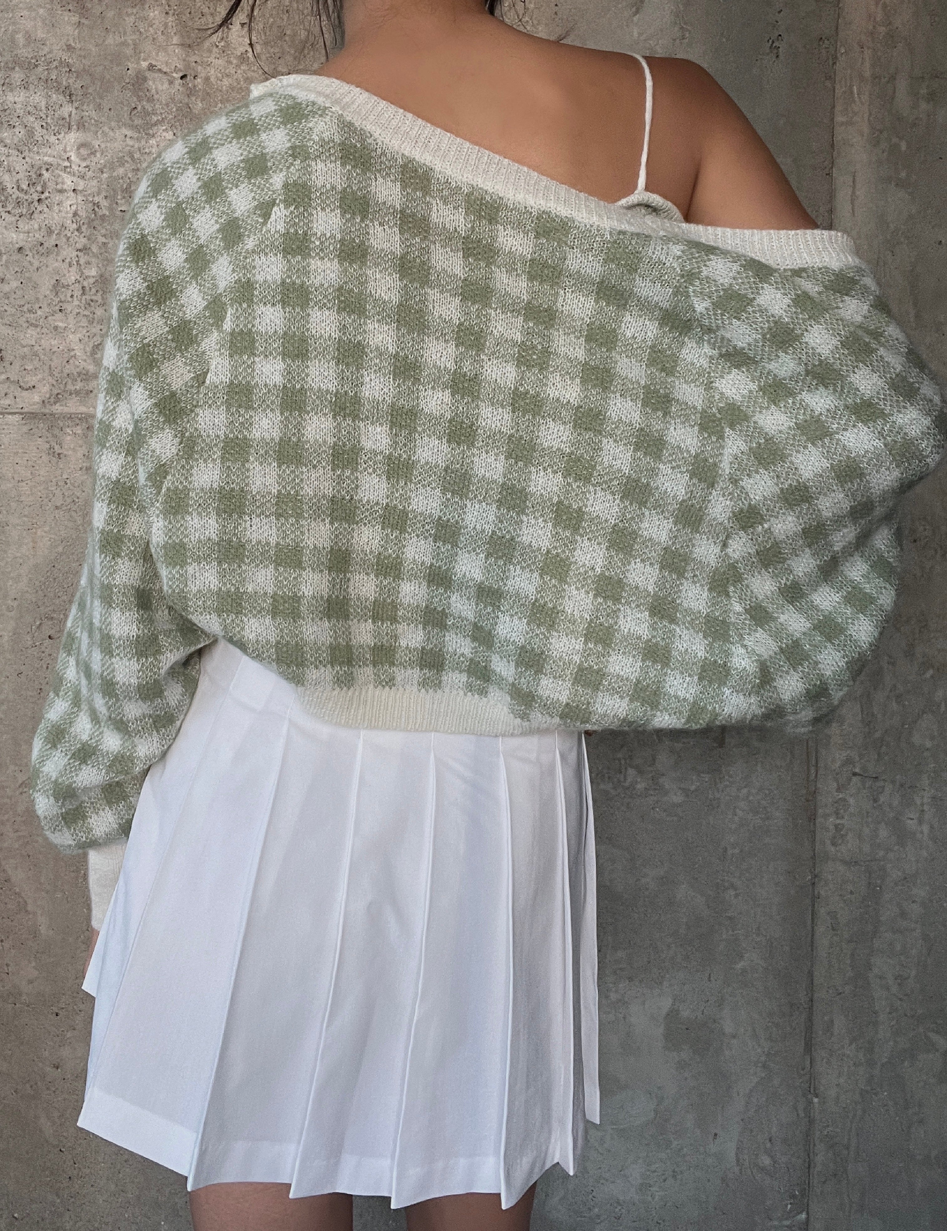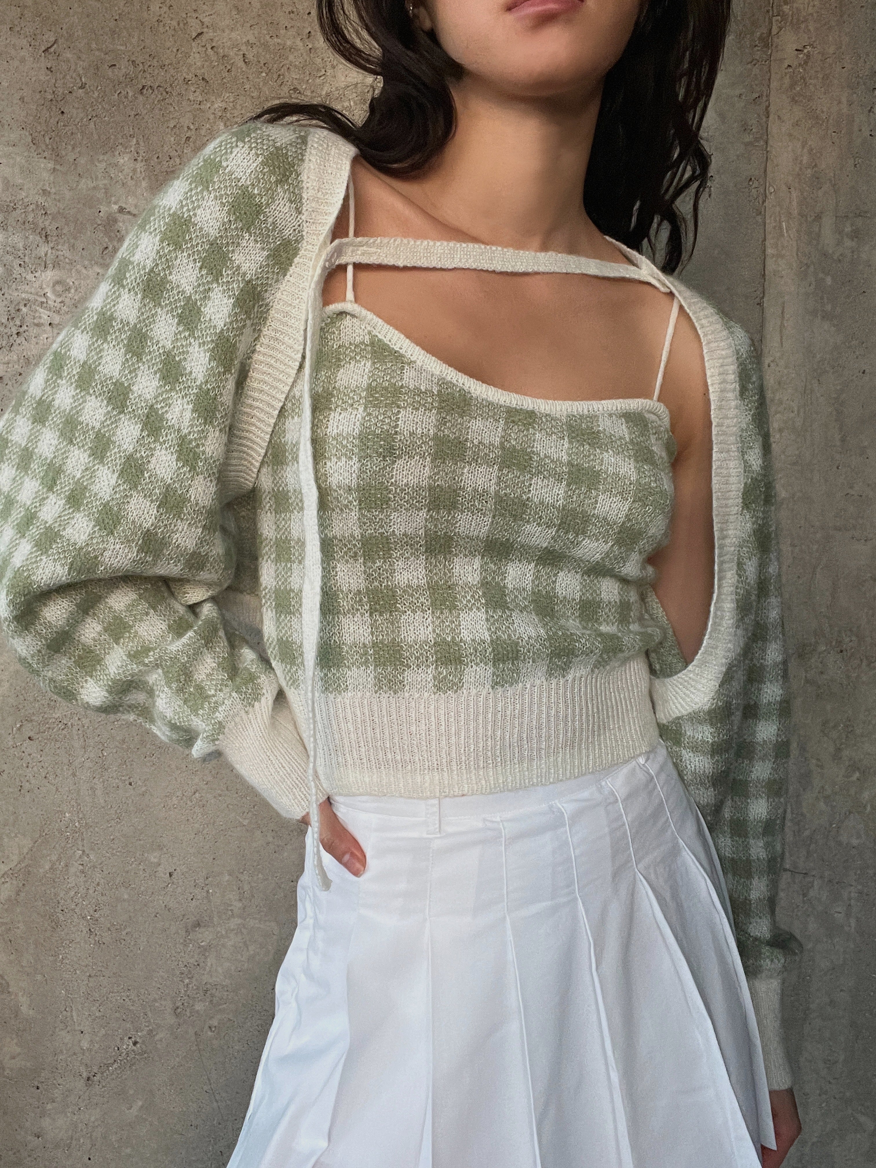 The Waffle Knit Set comes with a sleeveless top and a cardigan. This Khaki colour is perfect for the colder season. Create a cute and cozy look by styling this set with sweatpants, bike shorts or our BA Pleated Skirt.