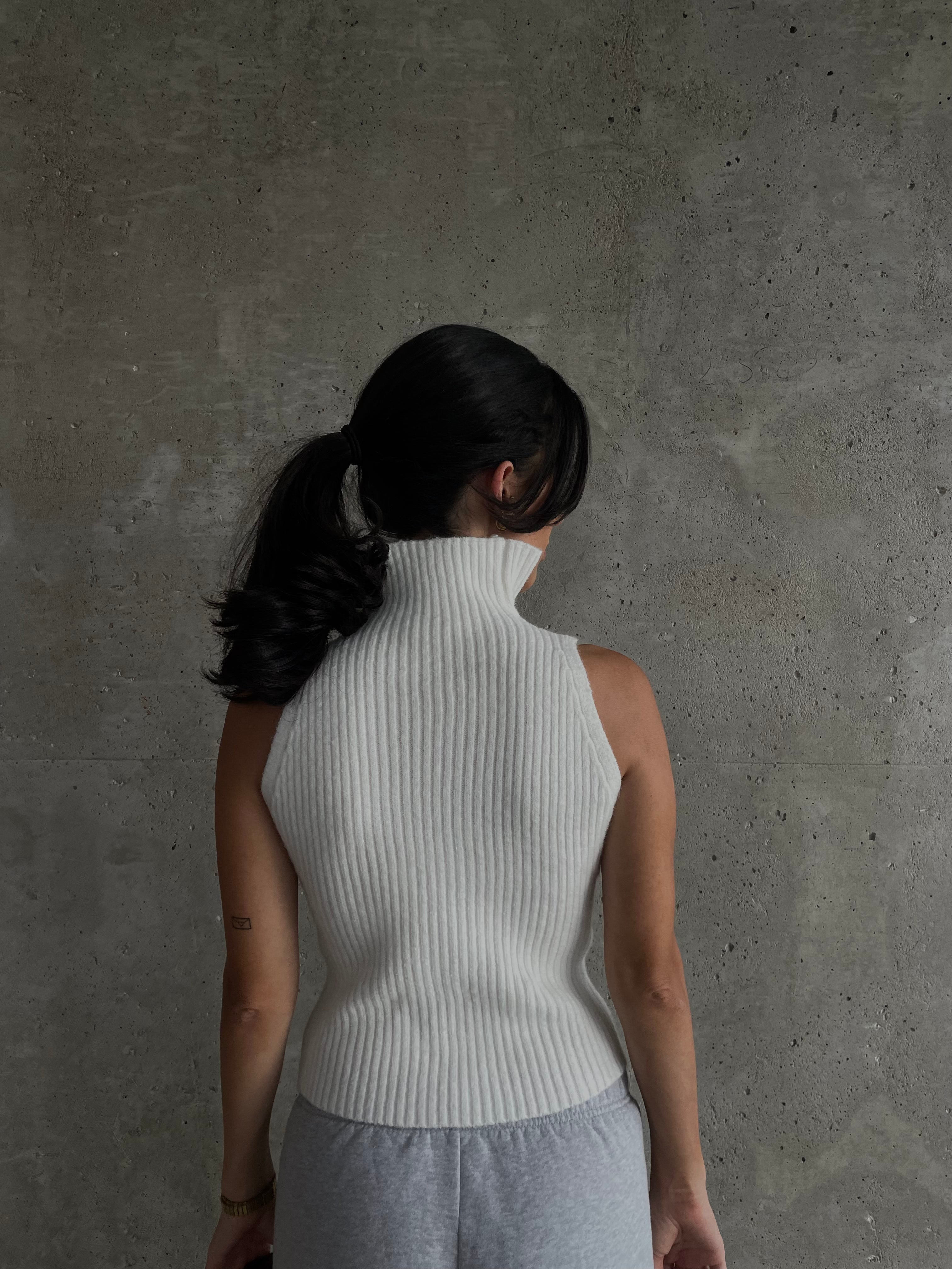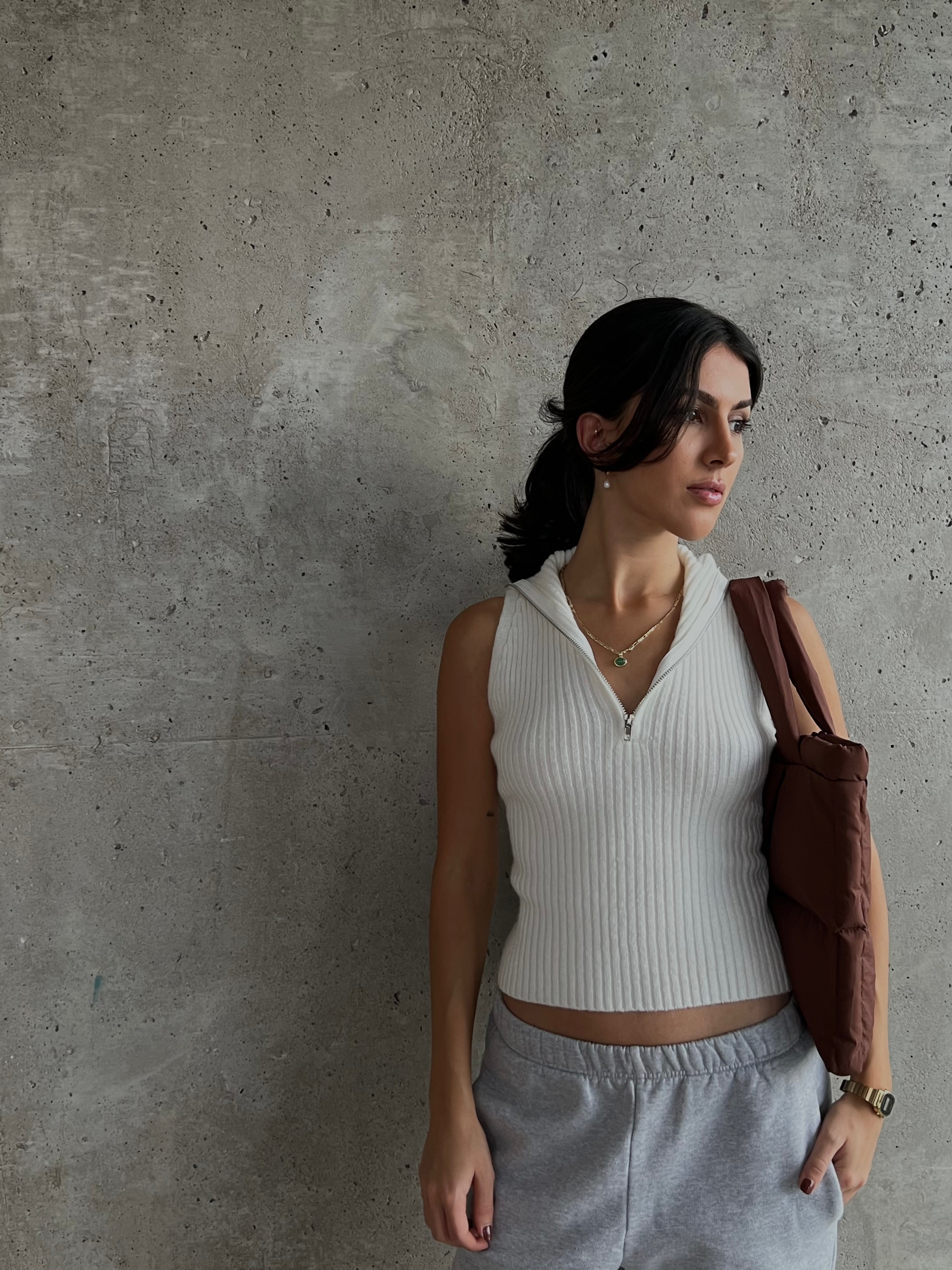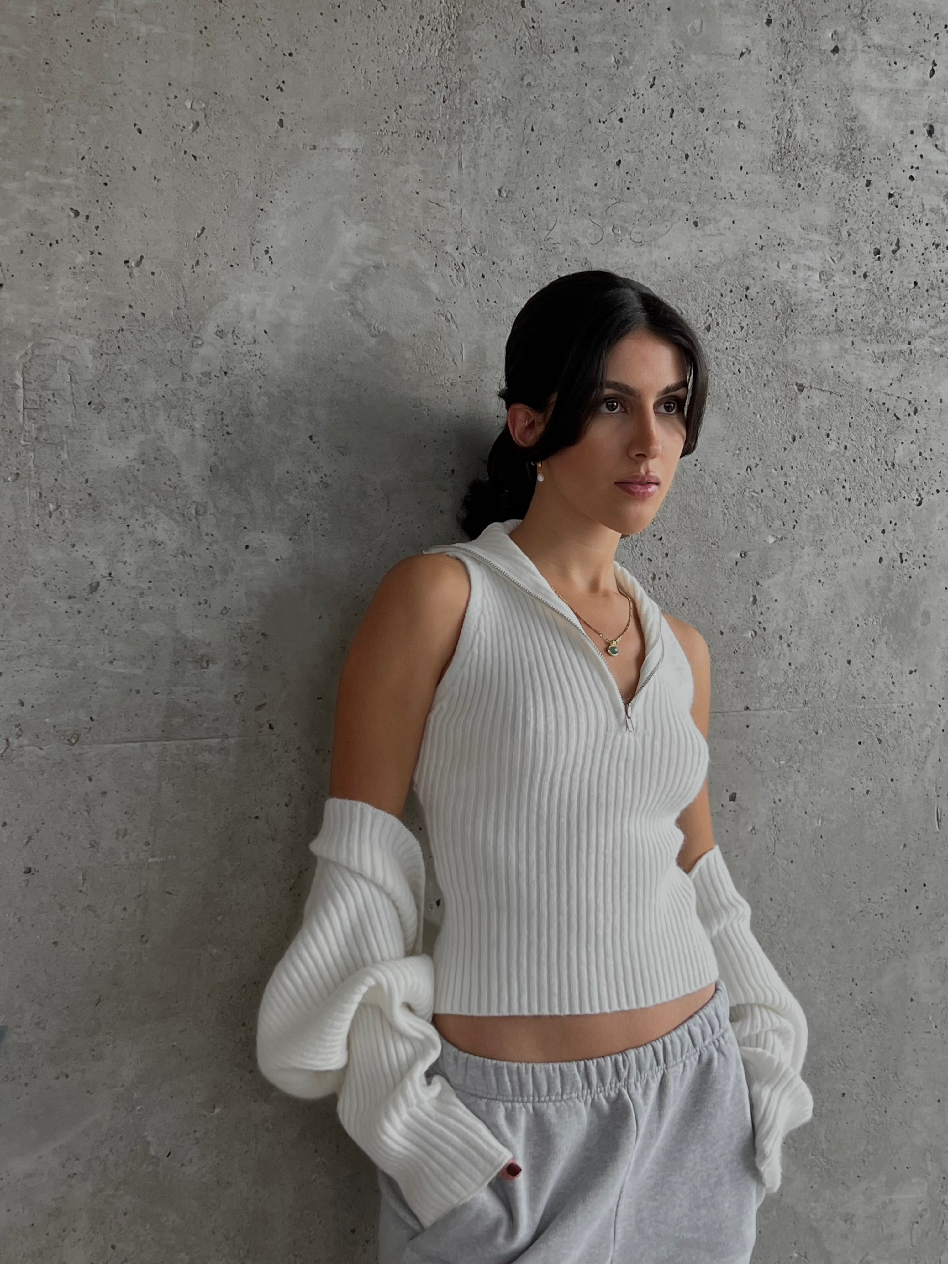 - Front zip on the sleeveless top